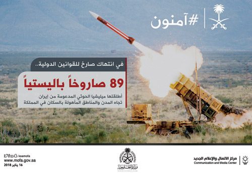 انفجار صاروخ باليستي حوثي أثناء محاولة إطلاقه. مستمرون في تحييد وتدمير القدرات النوعية للميليشيا الإرهابية في اليمن. أفادت قناة العربية فى نبأ عاجل لها مساء اليوم السبت بإعلان تحالف دعم الشرعية فى اليمن اعتراض وإحباط هجوم باليستى عدائى حوثى باتجاه المنطقة الشرقية فى السعودية.