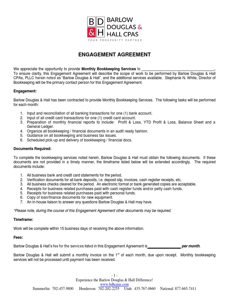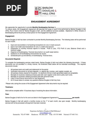Dave hallsba bookkeeping engagement letter bdh Engagement Letter Template for Accountants. Prepare your client for what they can expect. Short Service 1-page Engagement Letter.